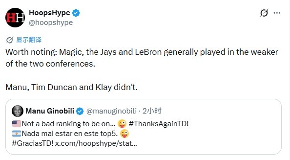 BOB半岛体育-美媒:詹姆斯魔术师双探花通常在较弱半区 马努邓肯克莱从来没有 byxiaoqiao 发表于2026年04月27日 4月15日讯 美媒HoopsHype列出统计数据,盘点NBA历史生涯每赛季季后赛胜场数Top10。马刺传奇吉诺比利位列第4,随后,吉诺比利转发该数据并写道:“能登上这份榜单,并且排名还不错😜阿根廷人能进前5,真不赖😜”该美媒转发吉诺比利动态,并回复道:“值得注意的是:魔术师、双探花和詹姆斯通常是在较弱的半区,而马努、邓肯和克莱则从来不是如此。” 你可能感兴趣的内容 上一篇文章 罗马里奥被比他小35岁学生女友甩了,他被曝与对方闺蜜出轨 发表于2026年04月09日 byxiaoqiao 查看文章 下一篇文章 BOB半岛体育官方网站-比肩乔詹科杜!塔图姆30岁前季后赛得分突破3000分 NBA历史第5人 发表于2026年04月27日 byxiaoqiao 查看文章 你可能会喜欢