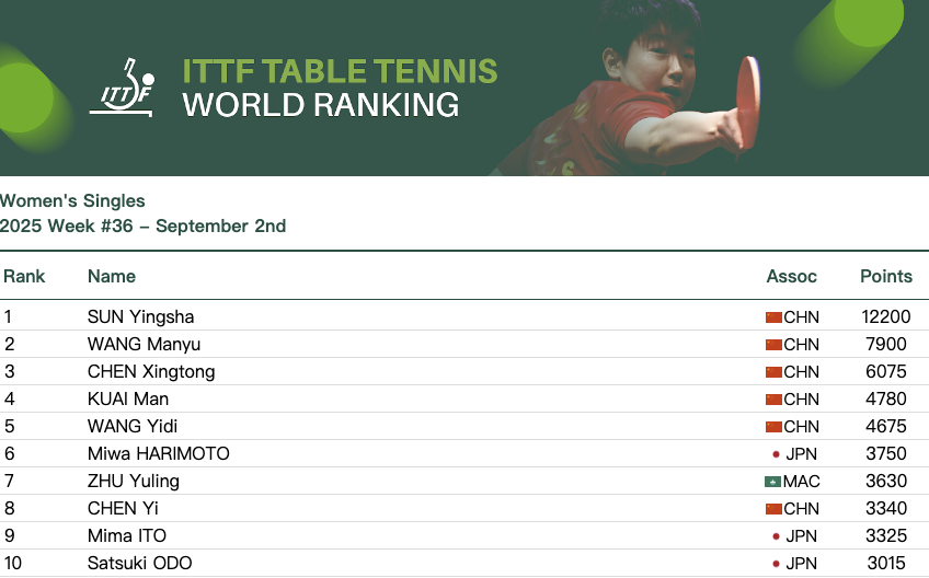 BOB半岛体育-国际乒联2025年第36周排名公布,孙颖莎保持断层第一