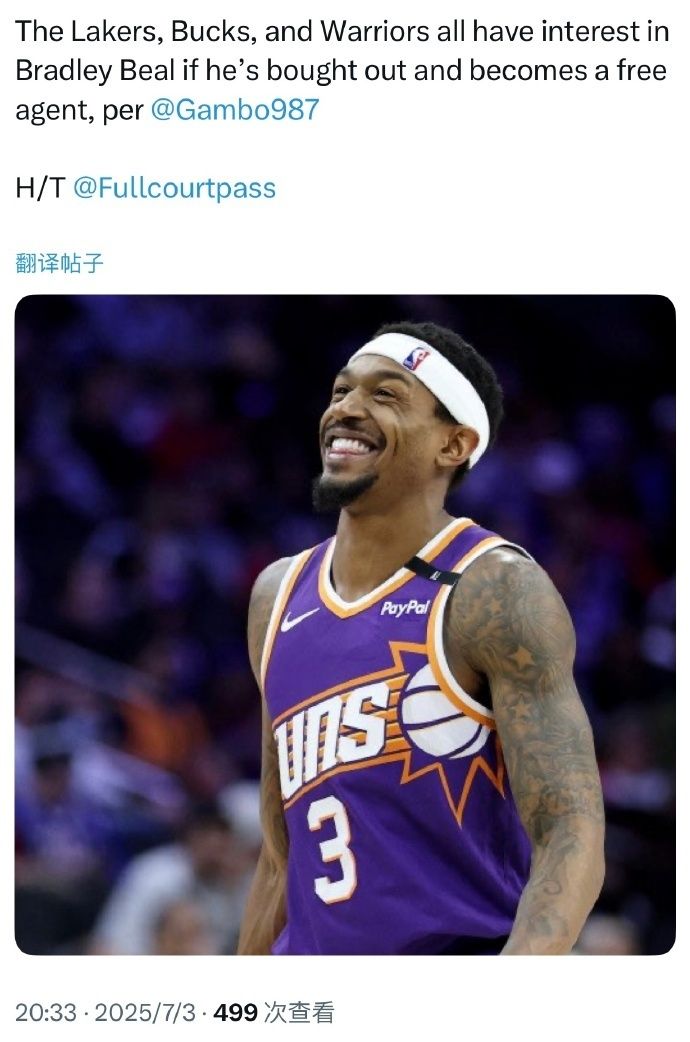 剩两年1.1亿!太阳商讨买断需比尔放弃1300万 湖人勇士雄鹿有意