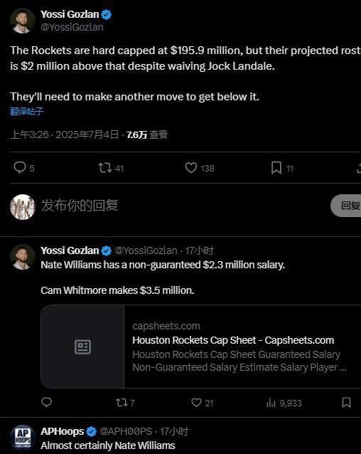 美媒APHoops则回复写道:“几乎可以肯定火箭队将选择裁掉内威。”